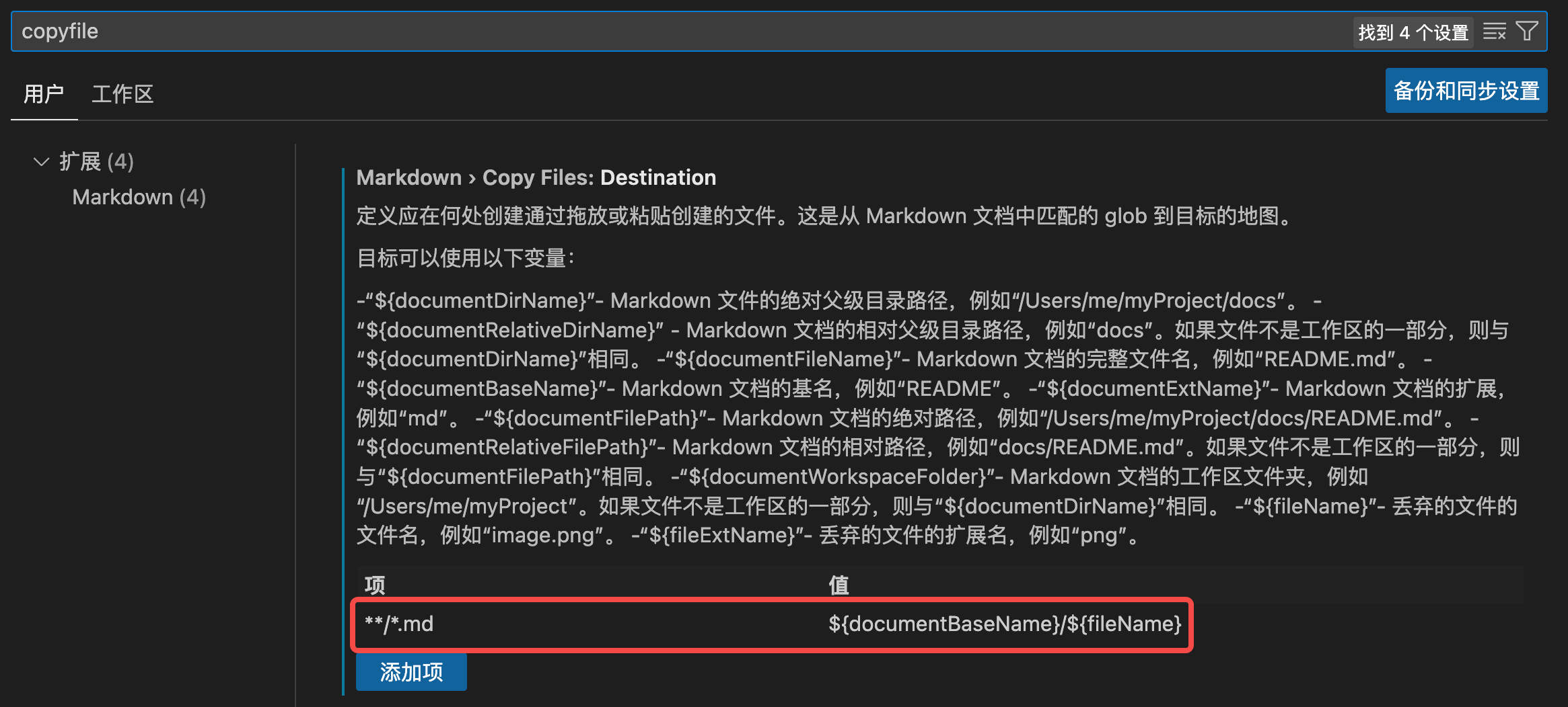 在 vscode 的设置中找到 Markdown > Copy Files > Destination,在下面添加一项,项为 **/*.md,值为 ${documentBaseName}/${fileName}。